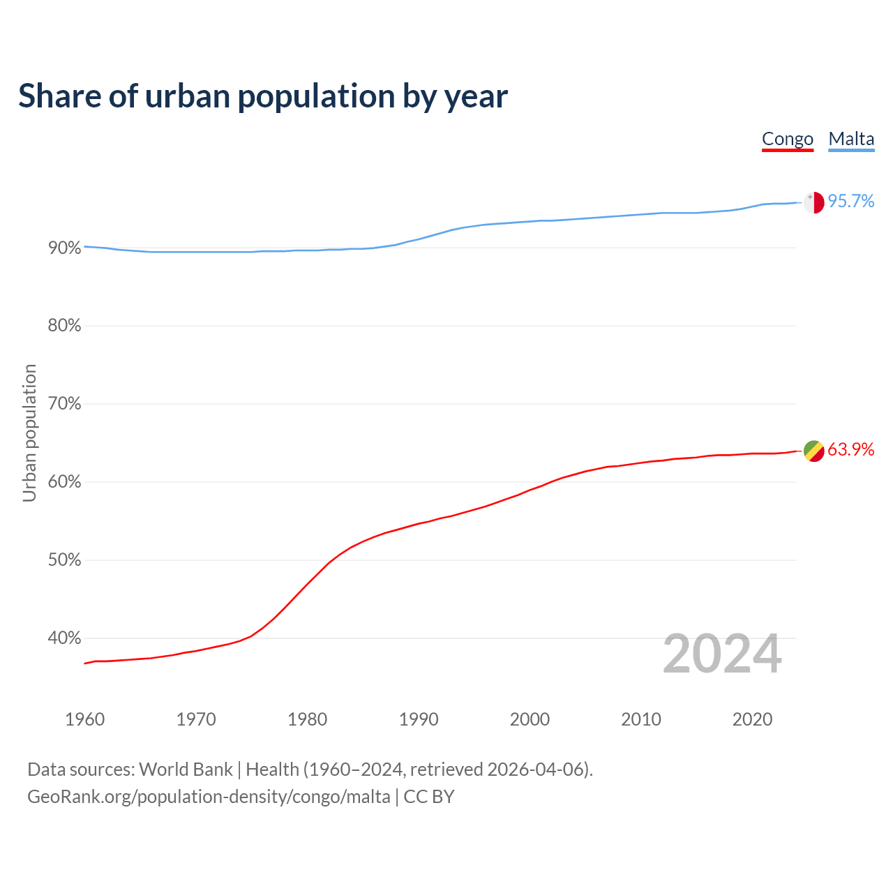 From 2004 to 2024, the share of urban population changed from 60.9% to 63.9% in the Congo and from 93.6% to 95.7% in Malta.