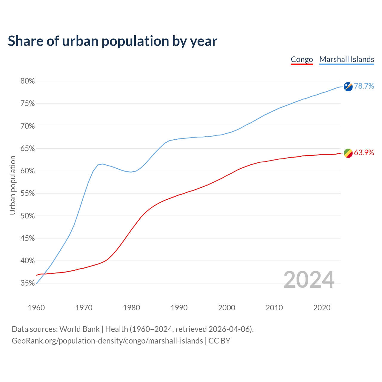 From 2004 to 2024, the share of urban population changed from 60.9% to 63.9% in the Congo and from 70.1% to 78.7% in the Marshall Islands.