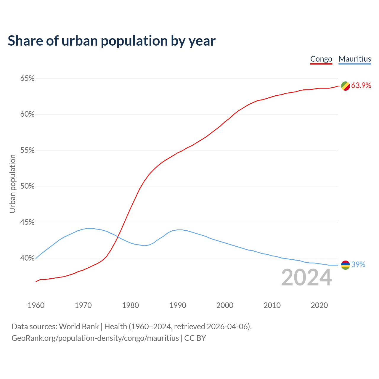 From 2004 to 2024, the share of urban population changed from 60.9% to 63.9% in the Congo and from 41.3% to 39% in Mauritius.