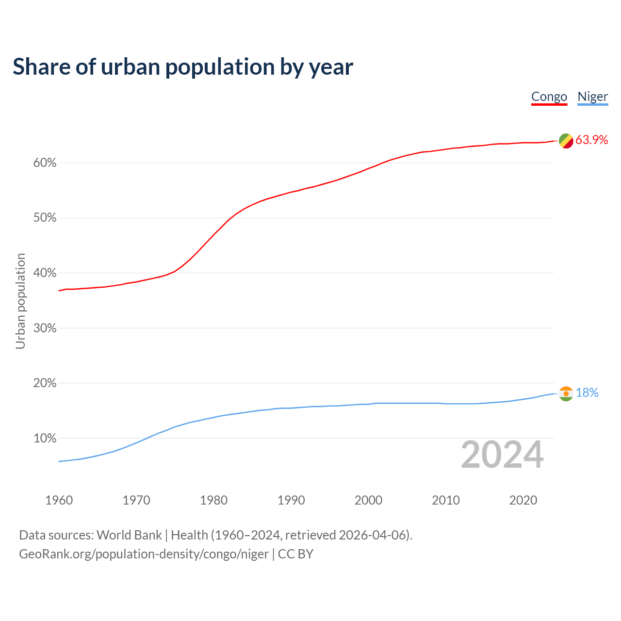 From 2004 to 2024, the share of urban population changed from 60.9% to 63.9% in the Congo and from 16.3% to 18% in Niger.