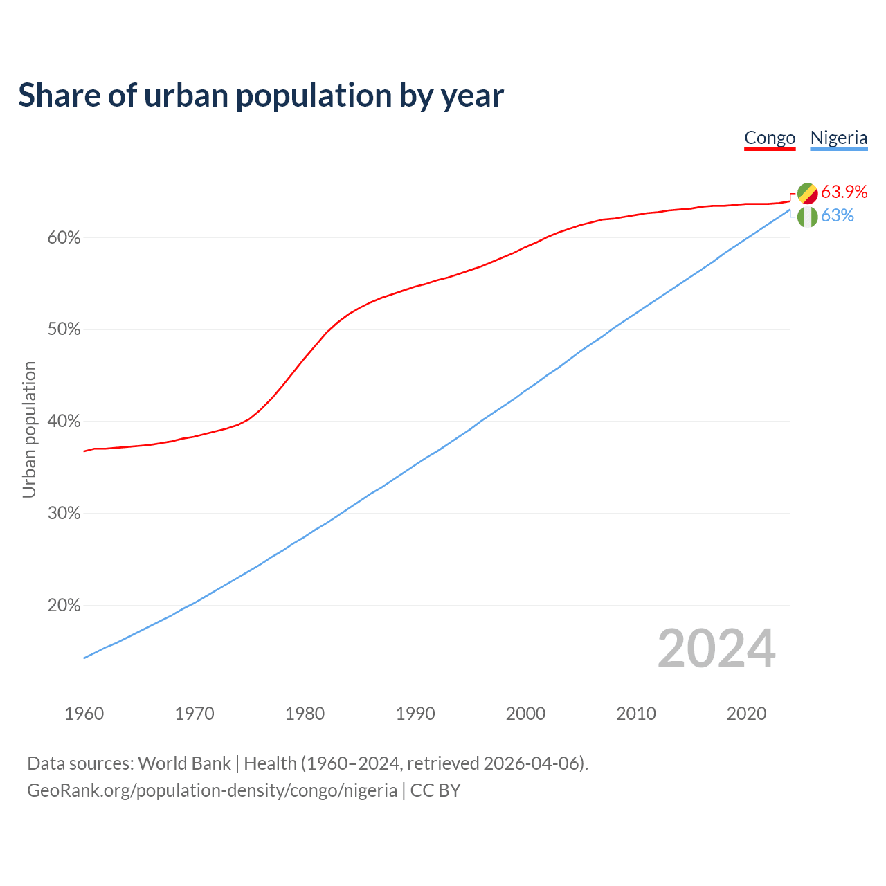 From 2004 to 2024, the share of urban population changed from 60.9% to 63.9% in the Congo and from 46.7% to 63% in Nigeria.