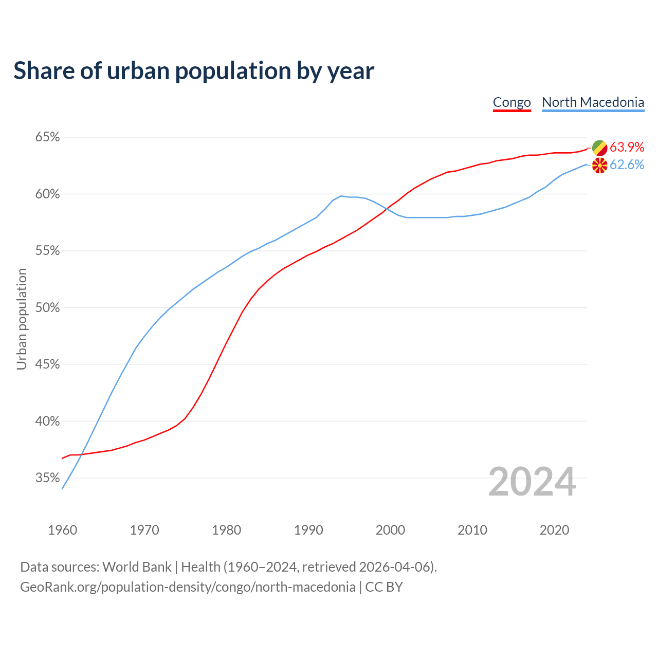 From 2004 to 2024, the share of urban population changed from 60.9% to 63.9% in the Congo and from 57.9% to 62.6% in North Macedonia.