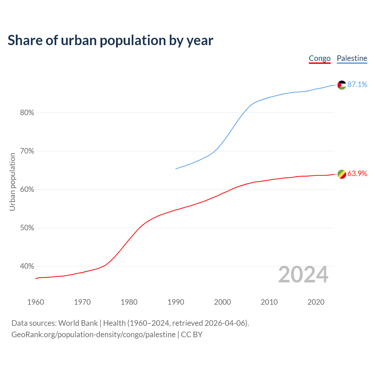 From 2004 to 2024, the share of urban population changed from 60.9% to 63.9% in the Congo and from 79% to 87.1% in Palestine.