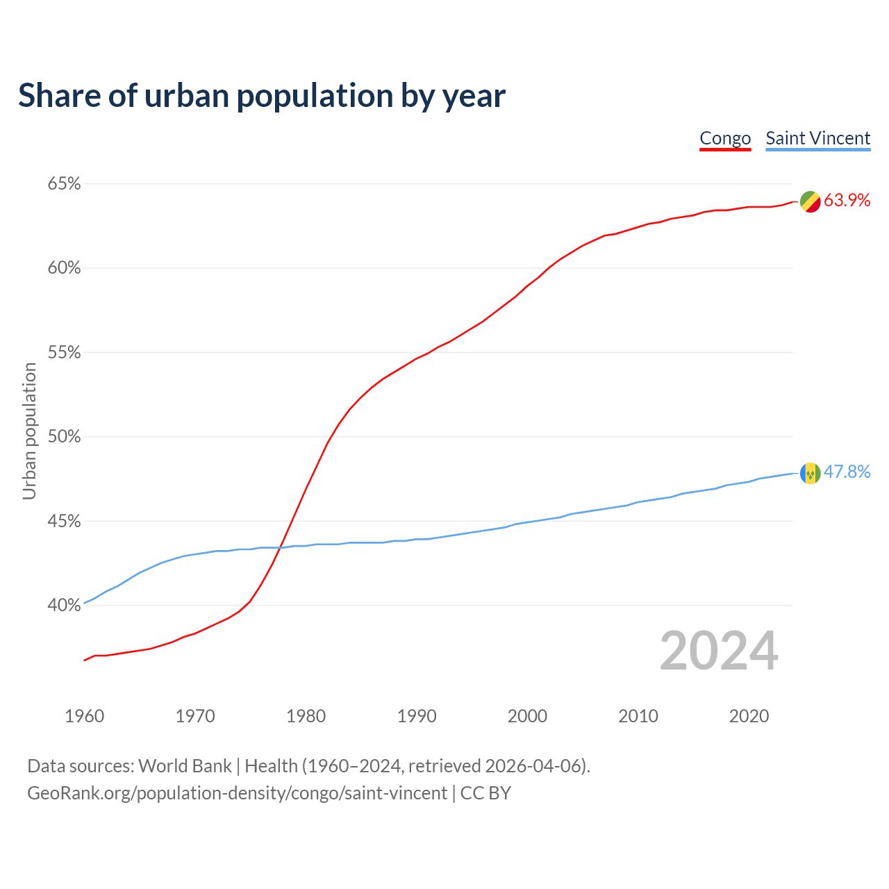 From 2004 to 2024, the share of urban population changed from 60.9% to 63.9% in the Congo and from 45.4% to 47.8% in Saint Vincent.