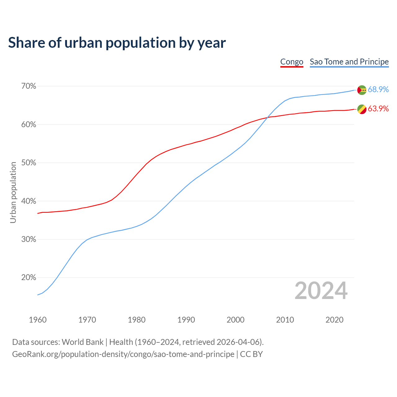 From 2004 to 2024, the share of urban population changed from 60.9% to 63.9% in the Congo and from 57.9% to 68.9% in Sao Tome and Principe.