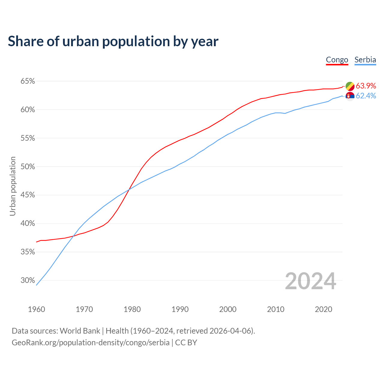 From 2004 to 2024, the share of urban population changed from 60.9% to 63.9% in the Congo and from 57.3% to 62.4% in Serbia.