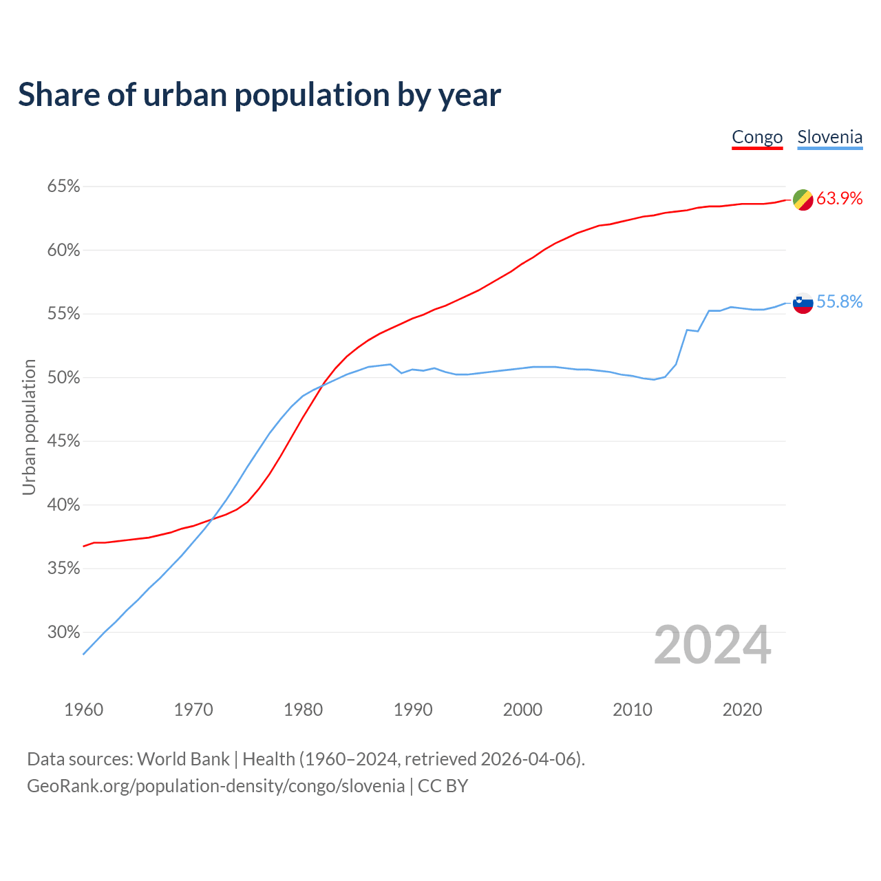 From 2004 to 2024, the share of urban population changed from 60.9% to 63.9% in the Congo and from 50.7% to 55.8% in Slovenia.