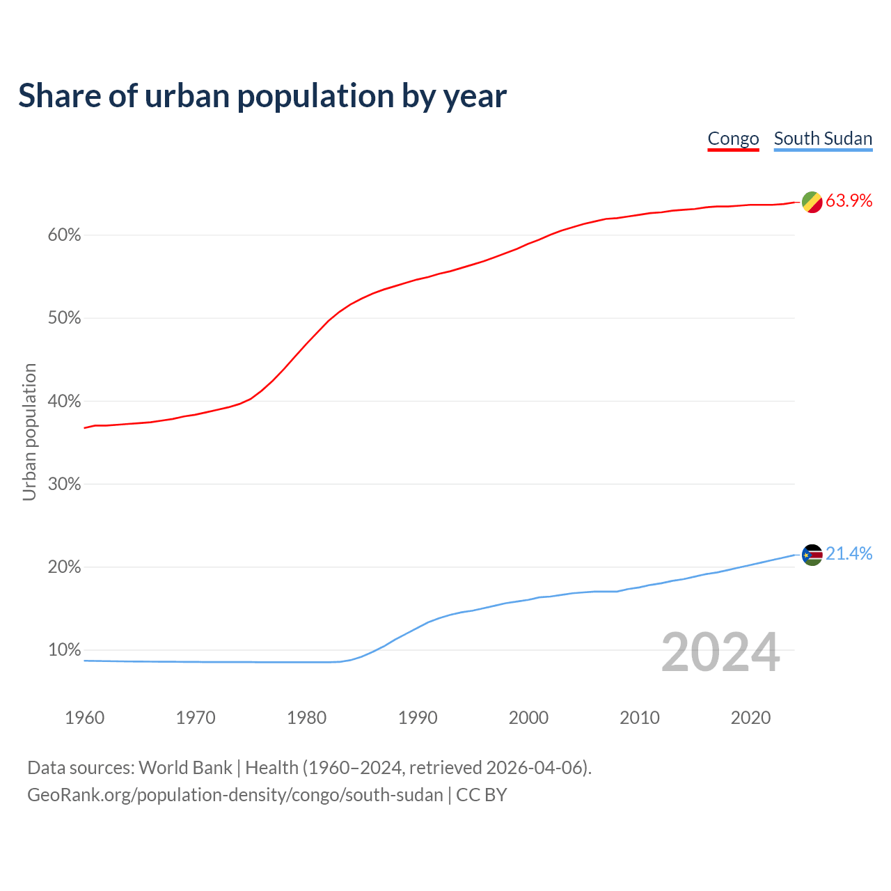 From 2004 to 2024, the share of urban population changed from 60.9% to 63.9% in the Congo and from 16.8% to 21.4% in South Sudan.