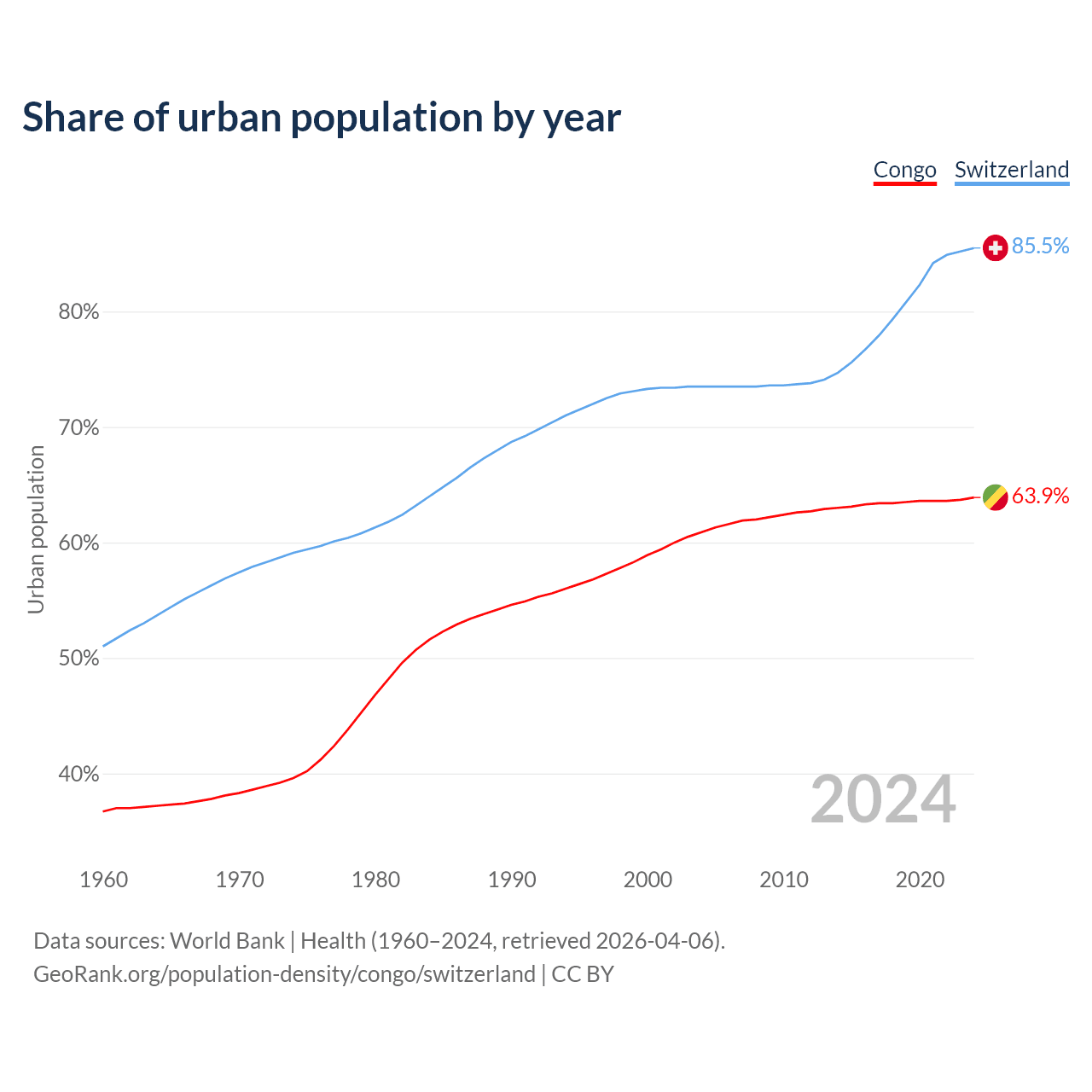 From 2004 to 2024, the share of urban population changed from 60.9% to 63.9% in the Congo and from 73.5% to 85.5% in Switzerland.