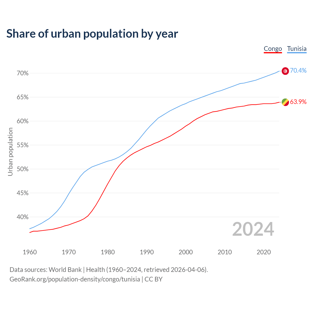 From 2004 to 2024, the share of urban population changed from 60.9% to 63.9% in the Congo and from 64.9% to 70.4% in Tunisia.