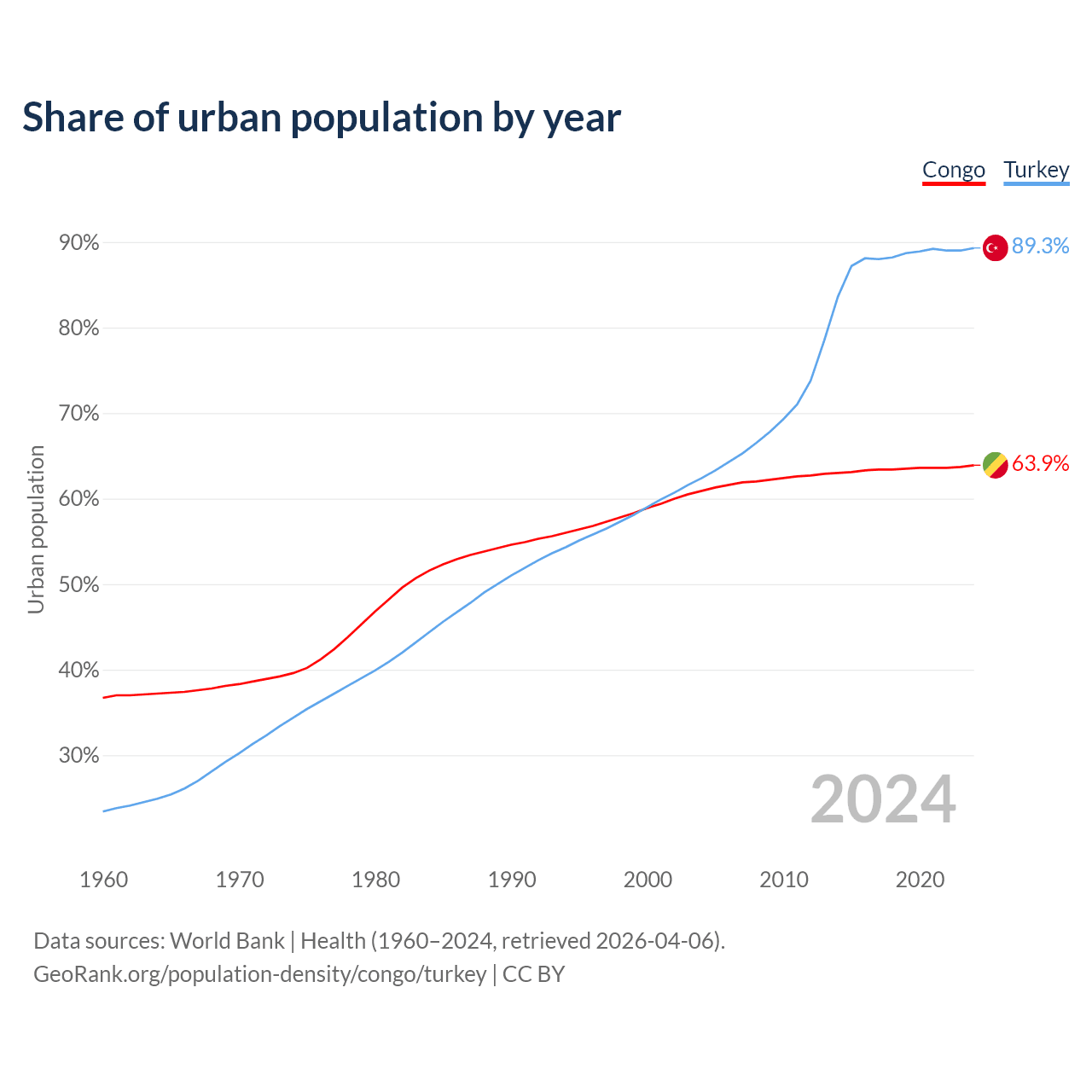 From 2004 to 2024, the share of urban population changed from 60.9% to 63.9% in the Congo and from 62.4% to 89.3% in Turkey.