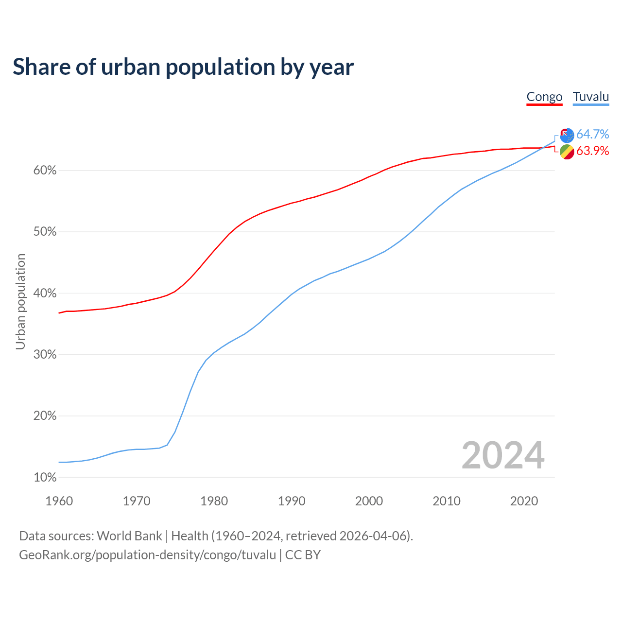 From 2004 to 2024, the share of urban population changed from 60.9% to 63.9% in the Congo and from 48.4% to 64.7% in Tuvalu.