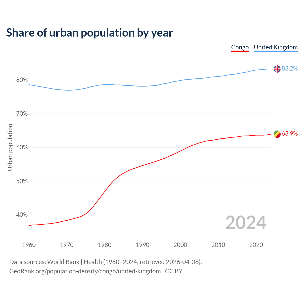 From 2004 to 2024, the share of urban population changed from 60.9% to 63.9% in the Congo and from 80.3% to 83.2% in the United Kingdom.