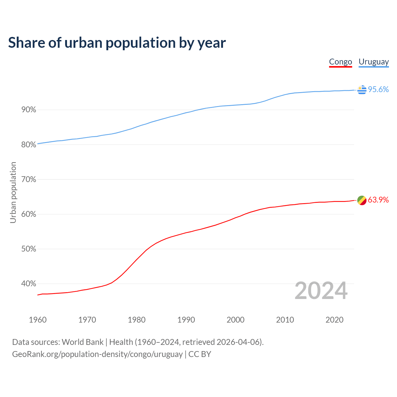 From 2004 to 2024, the share of urban population changed from 60.9% to 63.9% in the Congo and from 91.8% to 95.6% in Uruguay.