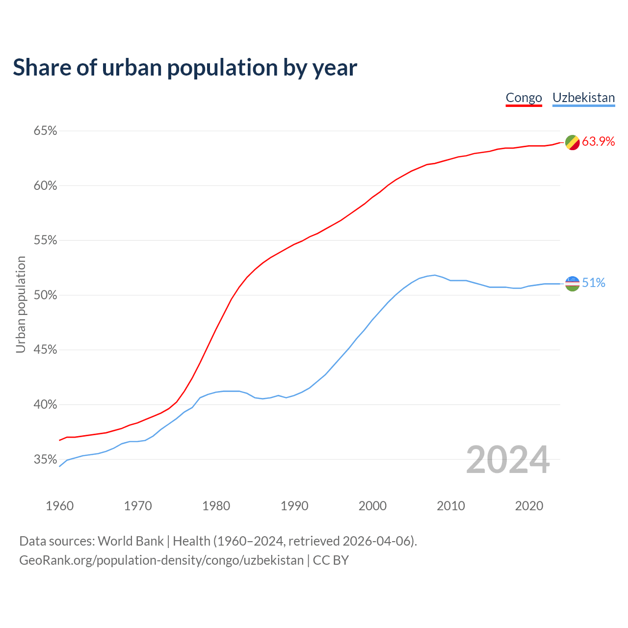 From 2004 to 2024, the share of urban population changed from 60.9% to 63.9% in the Congo and from 50.6% to 51% in Uzbekistan.
