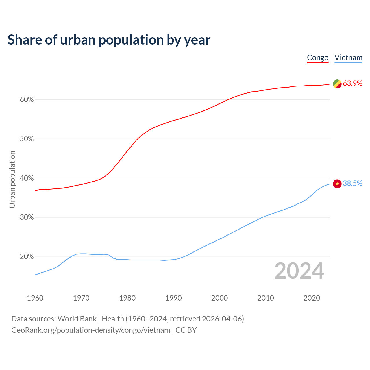 From 2004 to 2024, the share of urban population changed from 60.9% to 63.9% in the Congo and from 26.8% to 38.5% in Vietnam.