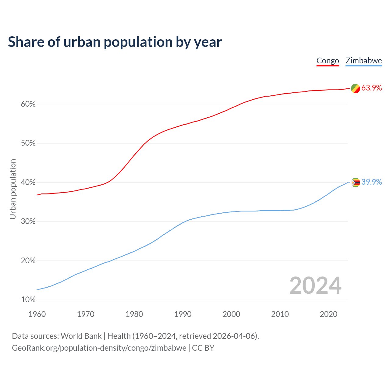 From 2004 to 2024, the share of urban population changed from 60.9% to 63.9% in the Congo and from 32.6% to 39.9% in Zimbabwe.