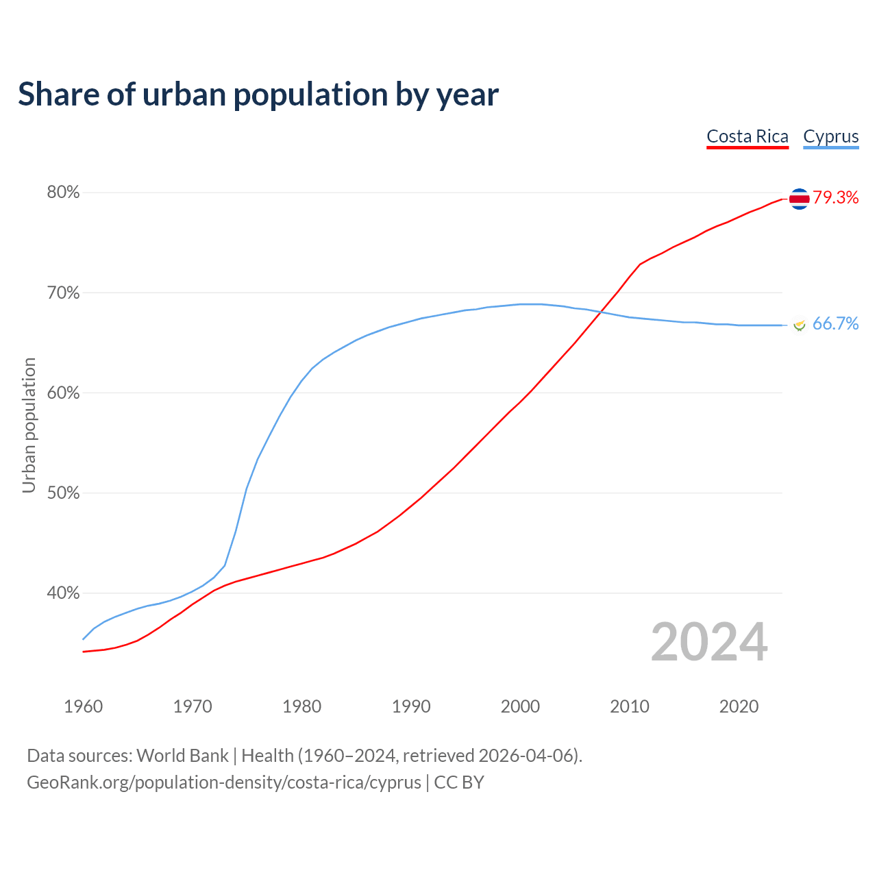 From 2004 to 2024, the share of urban population changed from 63.7% to 79.3% in Costa Rica and from 68.6% to 66.7% in Cyprus.