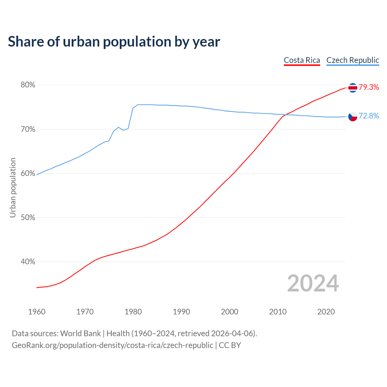 From 2004 to 2024, the share of urban population changed from 63.7% to 79.3% in Costa Rica and from 73.7% to 72.8% in the Czech Republic.