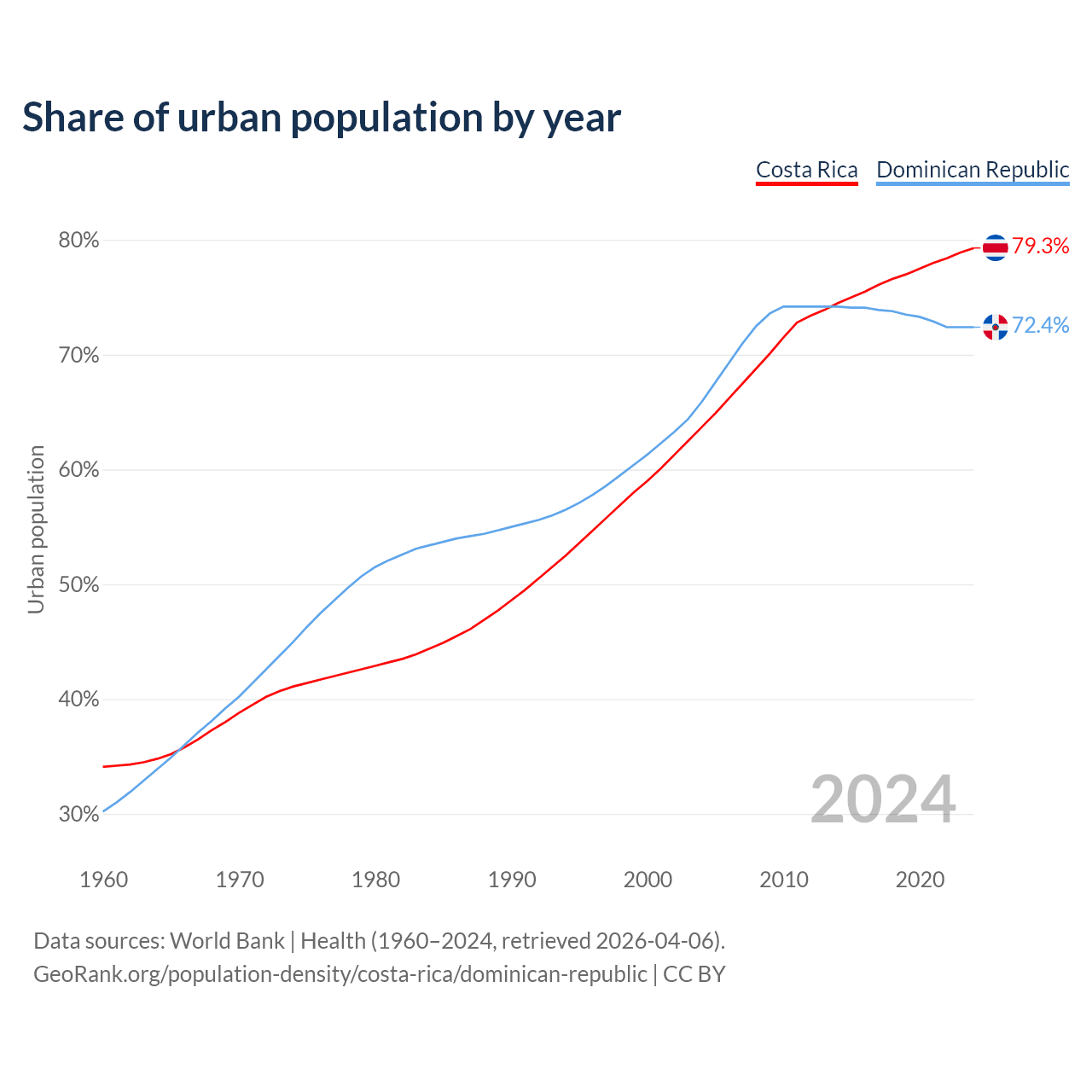 From 2004 to 2024, the share of urban population changed from 63.7% to 79.3% in Costa Rica and from 65.9% to 72.4% in the Dominican Republic.