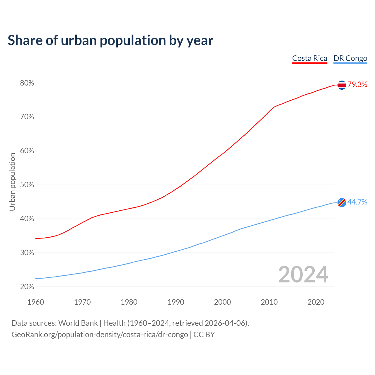 From 2004 to 2024, the share of urban population changed from 63.7% to 79.3% in Costa Rica and from 37% to 44.7% in the DR Congo.