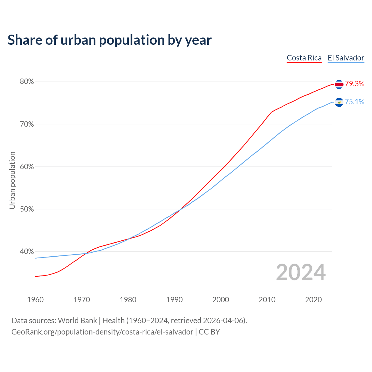 From 2004 to 2024, the share of urban population changed from 63.7% to 79.3% in Costa Rica and from 60.1% to 75.1% in El Salvador.