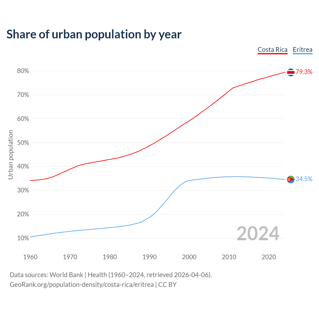 From 2004 to 2024, the share of urban population changed from 63.7% to 79.3% in Costa Rica and from 34.9% to 34.5% in Eritrea.