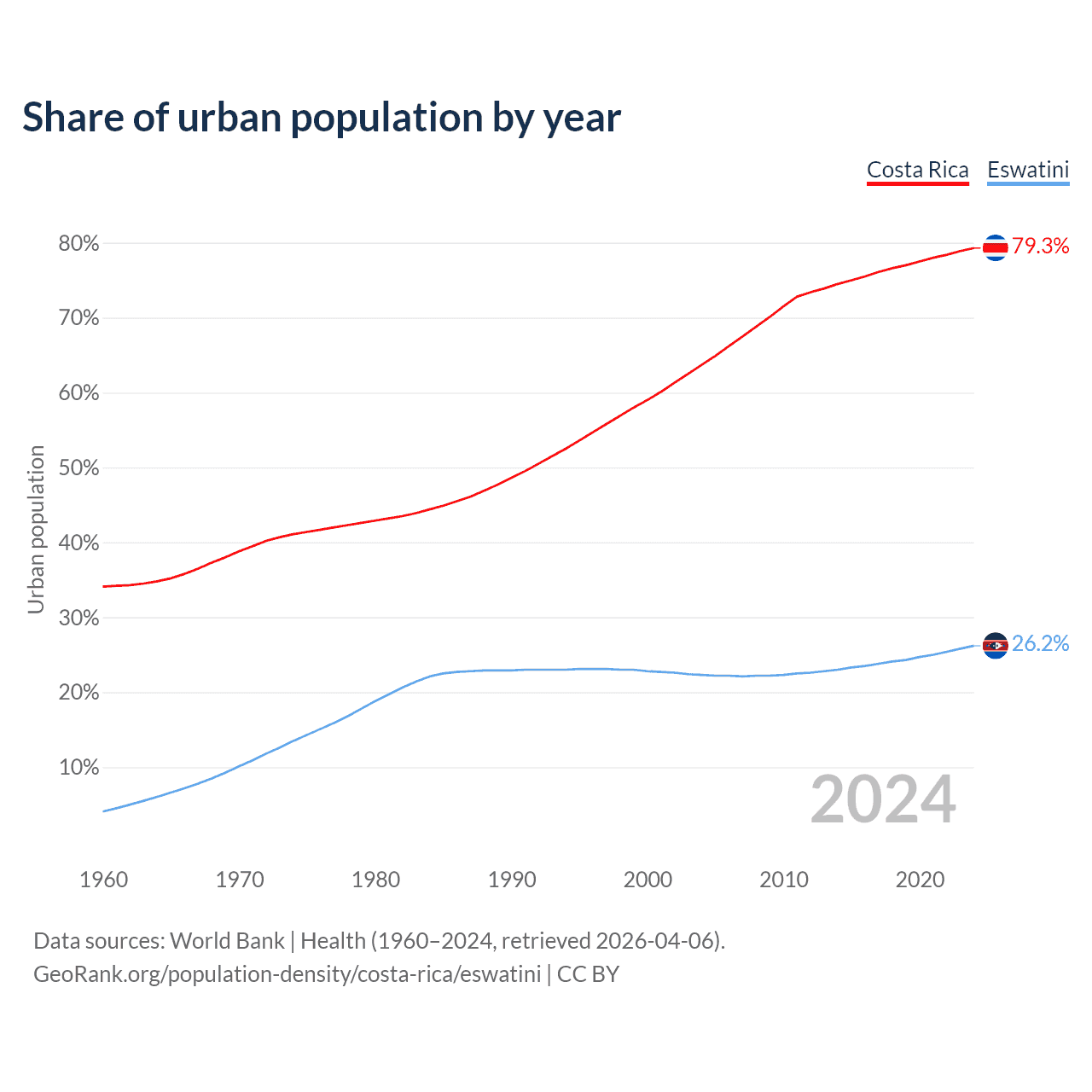 From 2004 to 2024, the share of urban population changed from 63.7% to 79.3% in Costa Rica and from 22.3% to 26.2% in Eswatini.