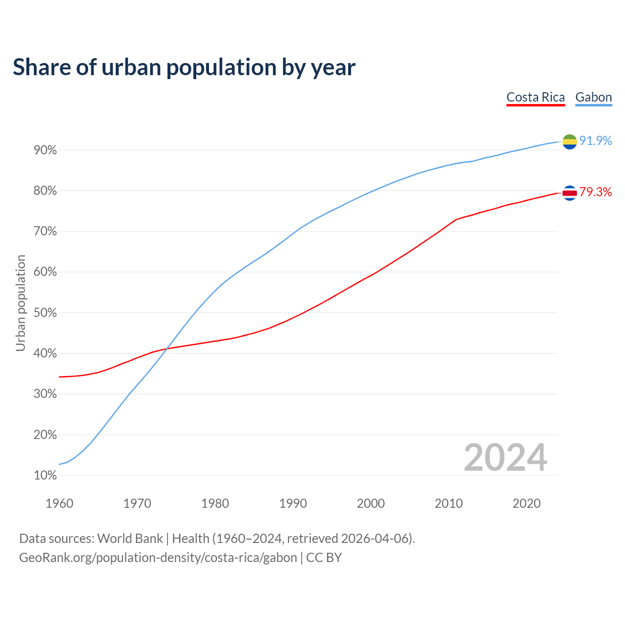 From 2004 to 2024, the share of urban population changed from 63.7% to 79.3% in Costa Rica and from 82.7% to 91.9% in Gabon.