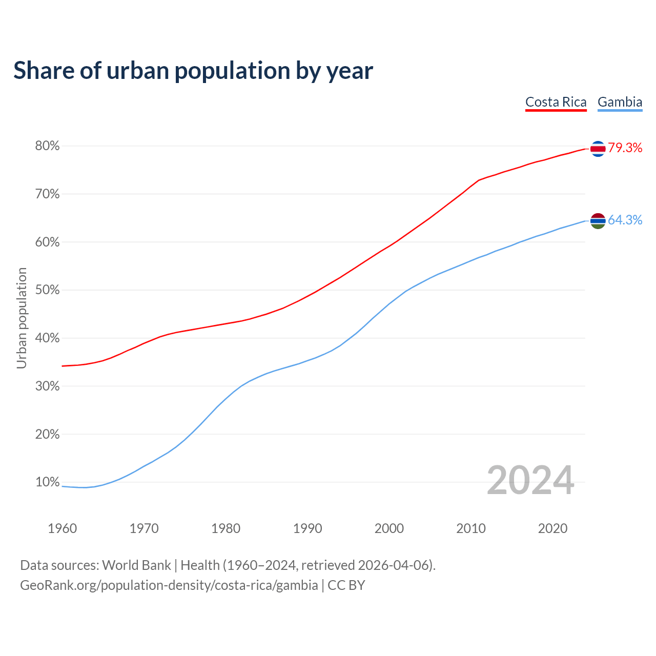 From 2004 to 2024, the share of urban population changed from 63.7% to 79.3% in Costa Rica and from 51.5% to 64.3% in the Gambia.