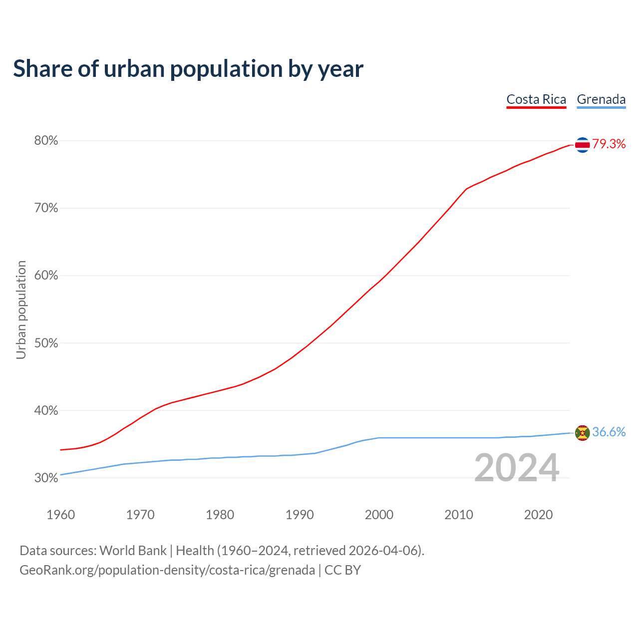 From 2004 to 2024, the share of urban population changed from 63.7% to 79.3% in Costa Rica and from 35.9% to 36.6% in Grenada.