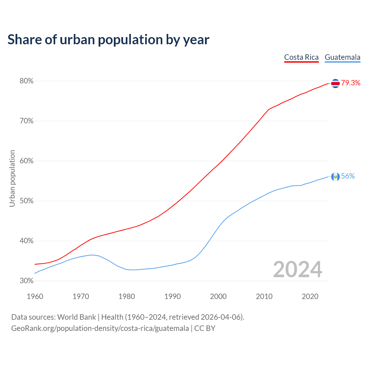 From 2004 to 2024, the share of urban population changed from 63.7% to 79.3% in Costa Rica and from 47.3% to 56% in Guatemala.