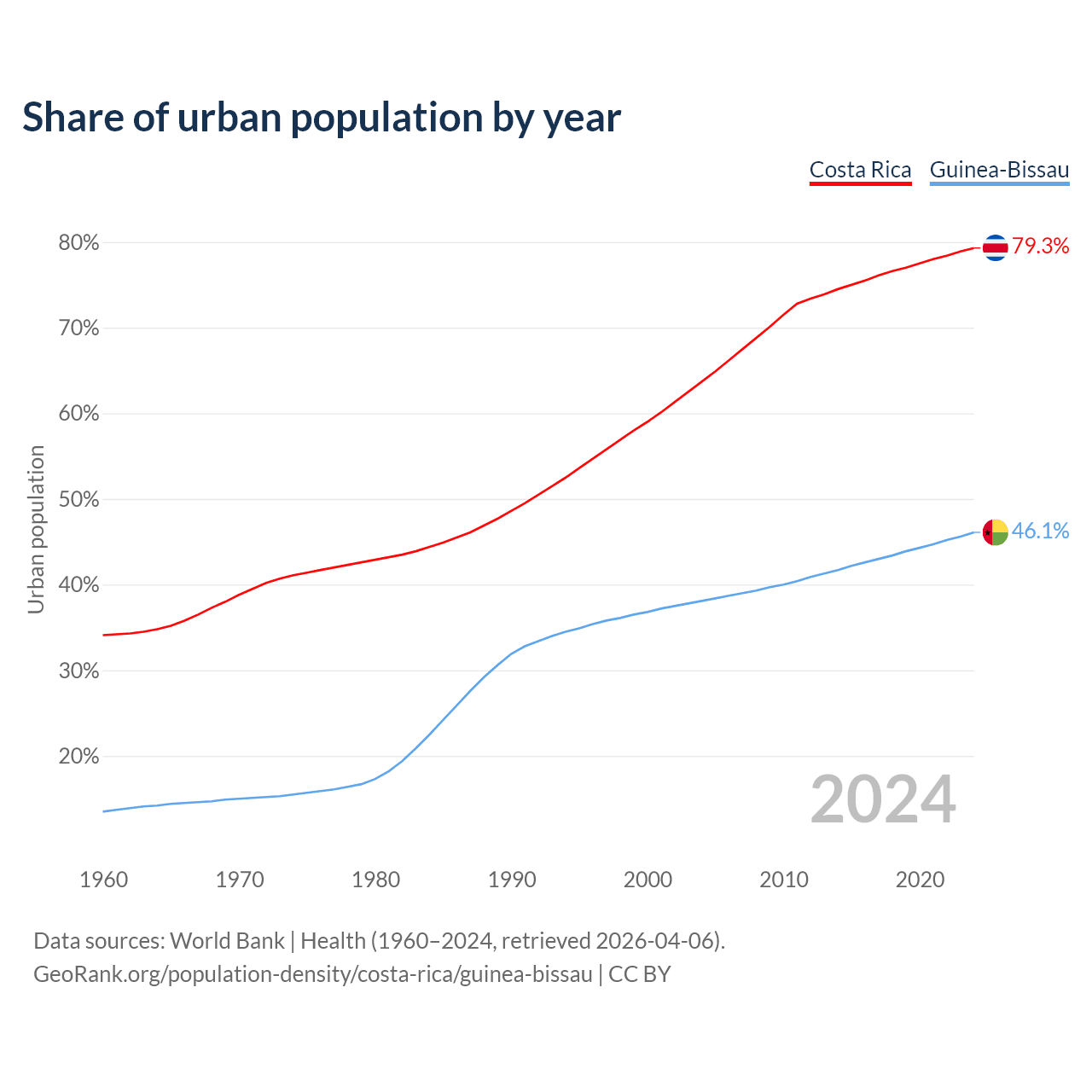 From 2004 to 2024, the share of urban population changed from 63.7% to 79.3% in Costa Rica and from 38.1% to 46.1% in Guinea-Bissau.