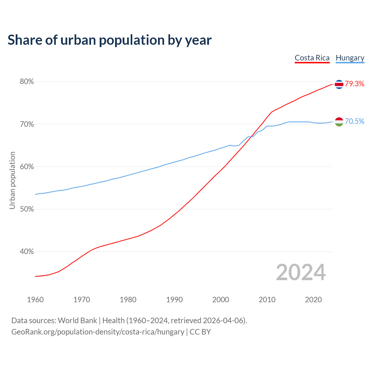 From 2004 to 2024, the share of urban population changed from 63.7% to 79.3% in Costa Rica and from 65% to 70.5% in Hungary.