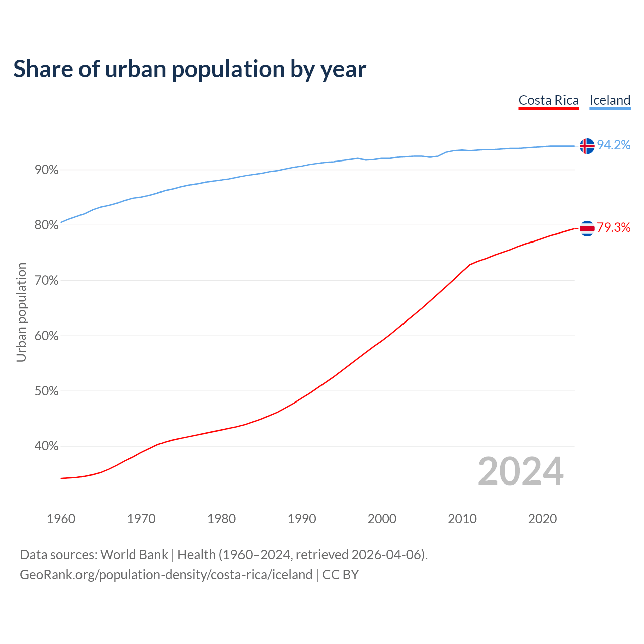 From 2004 to 2024, the share of urban population changed from 63.7% to 79.3% in Costa Rica and from 92.4% to 94.2% in Iceland.