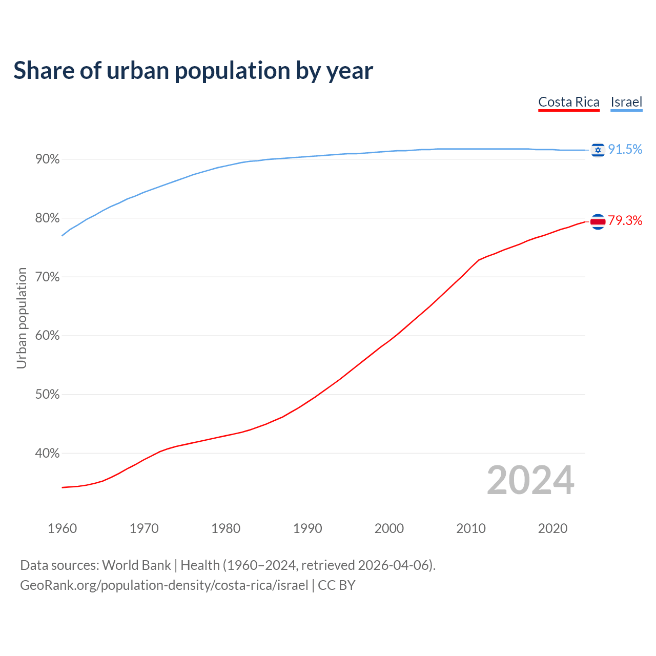 From 2004 to 2024, the share of urban population changed from 63.7% to 79.3% in Costa Rica and from 91.6% to 91.5% in Israel.