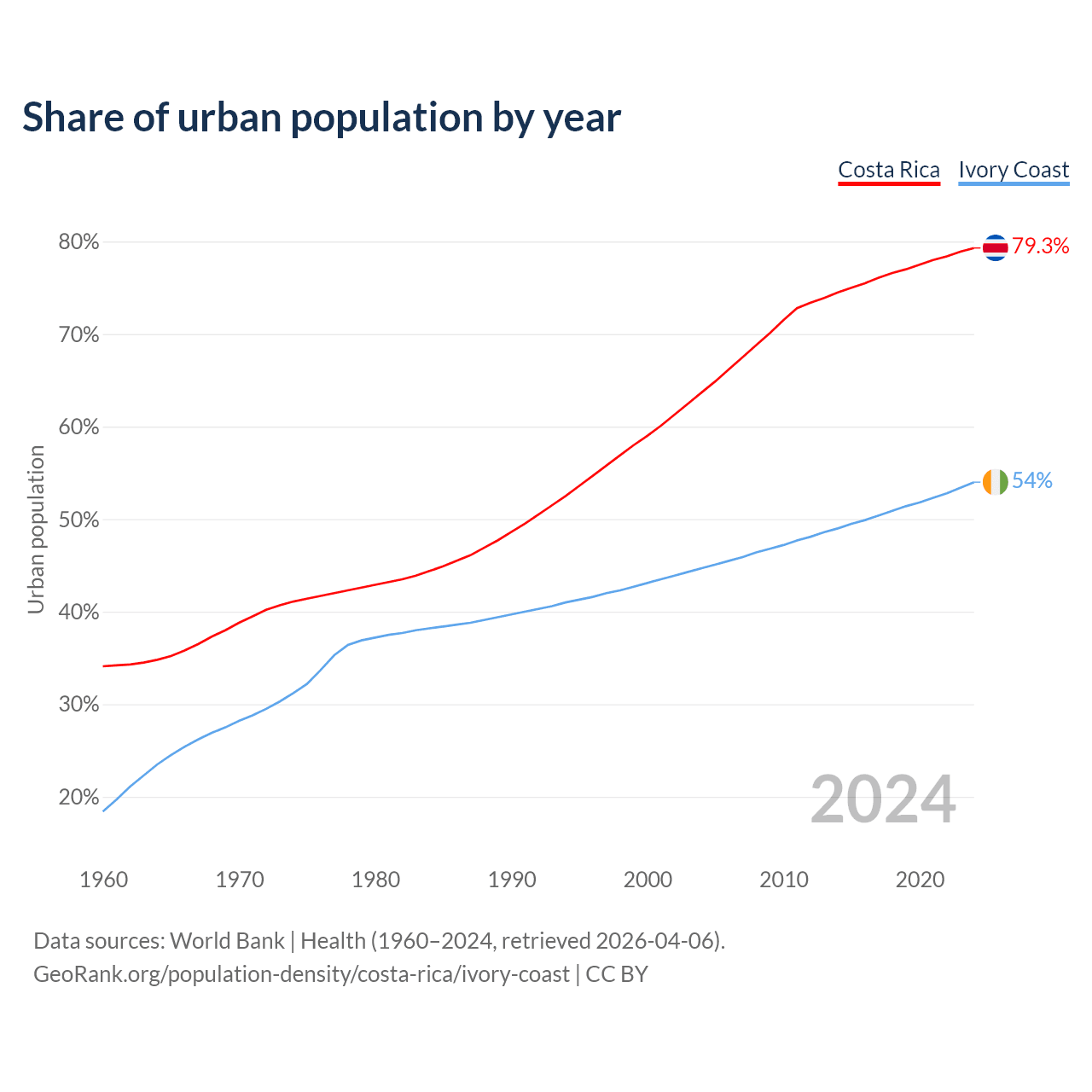 From 2004 to 2024, the share of urban population changed from 63.7% to 79.3% in Costa Rica and from 44.7% to 54% in Ivory Coast.