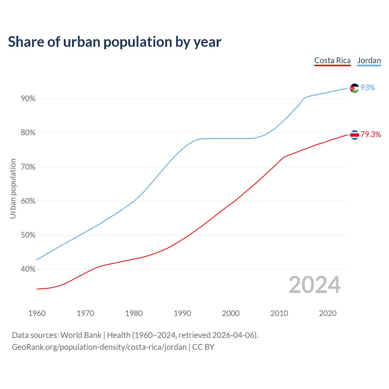 From 2004 to 2024, the share of urban population changed from 63.7% to 79.3% in Costa Rica and from 78.3% to 93% in Jordan.