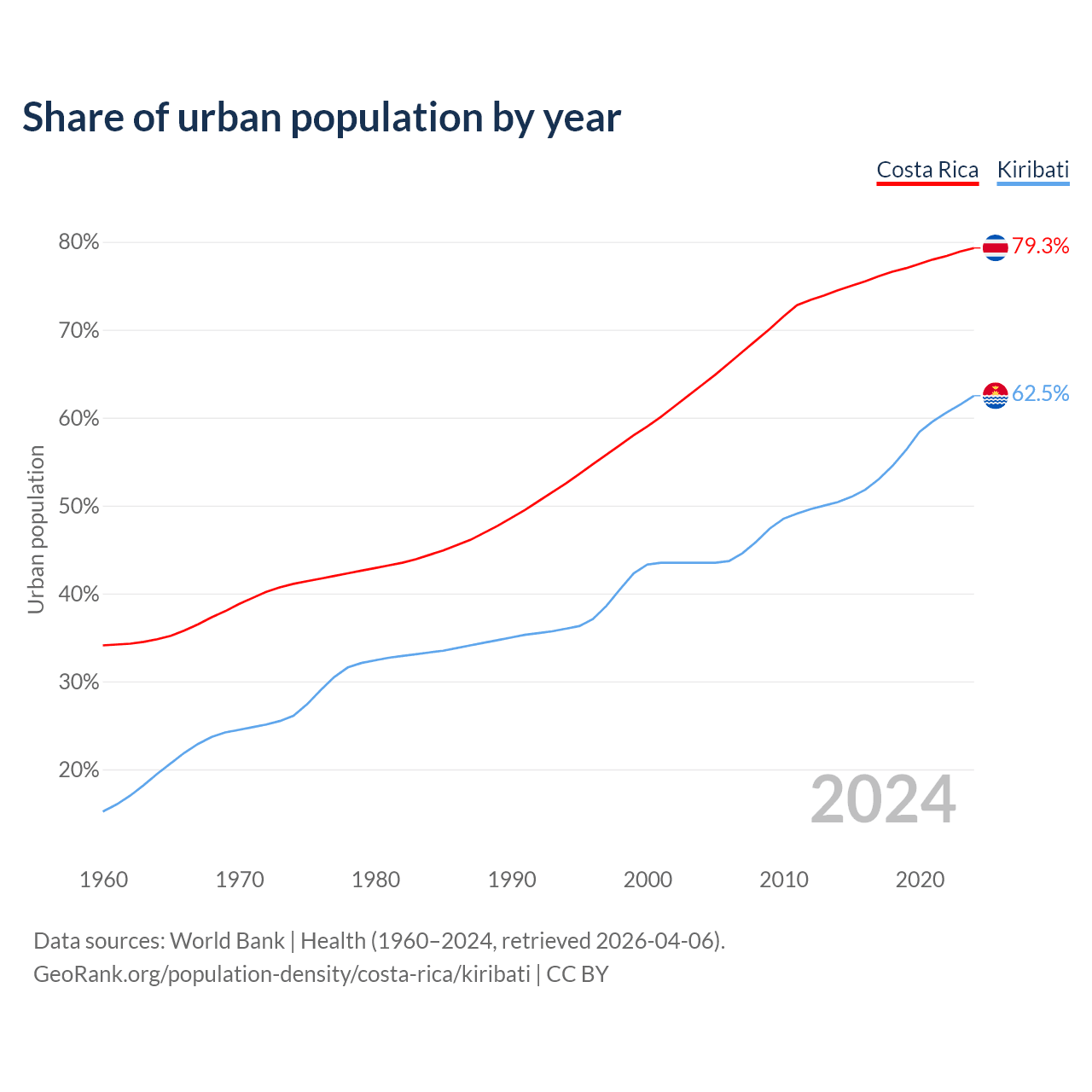 From 2004 to 2024, the share of urban population changed from 63.7% to 79.3% in Costa Rica and from 43.5% to 62.5% in Kiribati.
