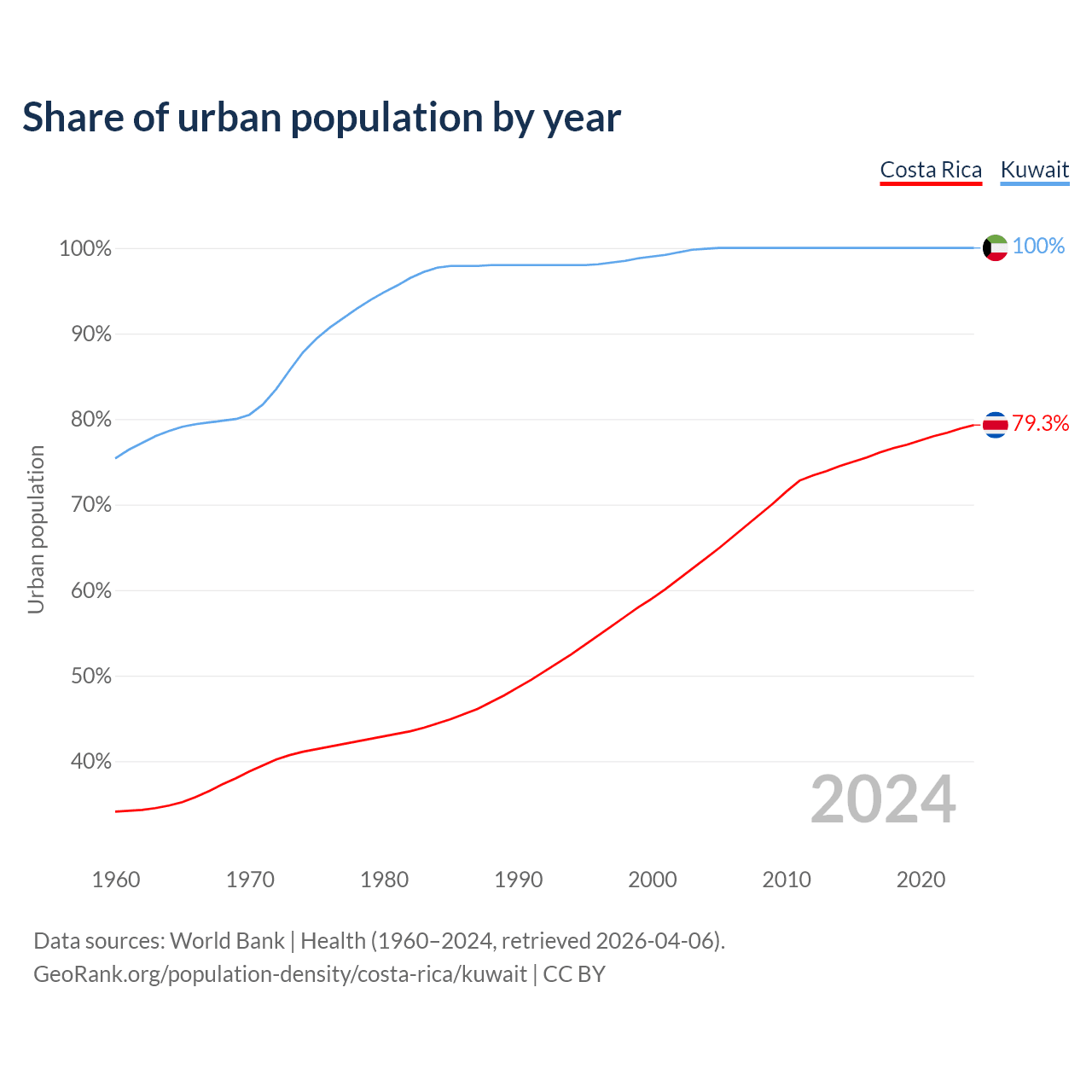 From 2004 to 2024, the share of urban population changed from 63.7% to 79.3% in Costa Rica and from 99.9% to 100% in Kuwait.