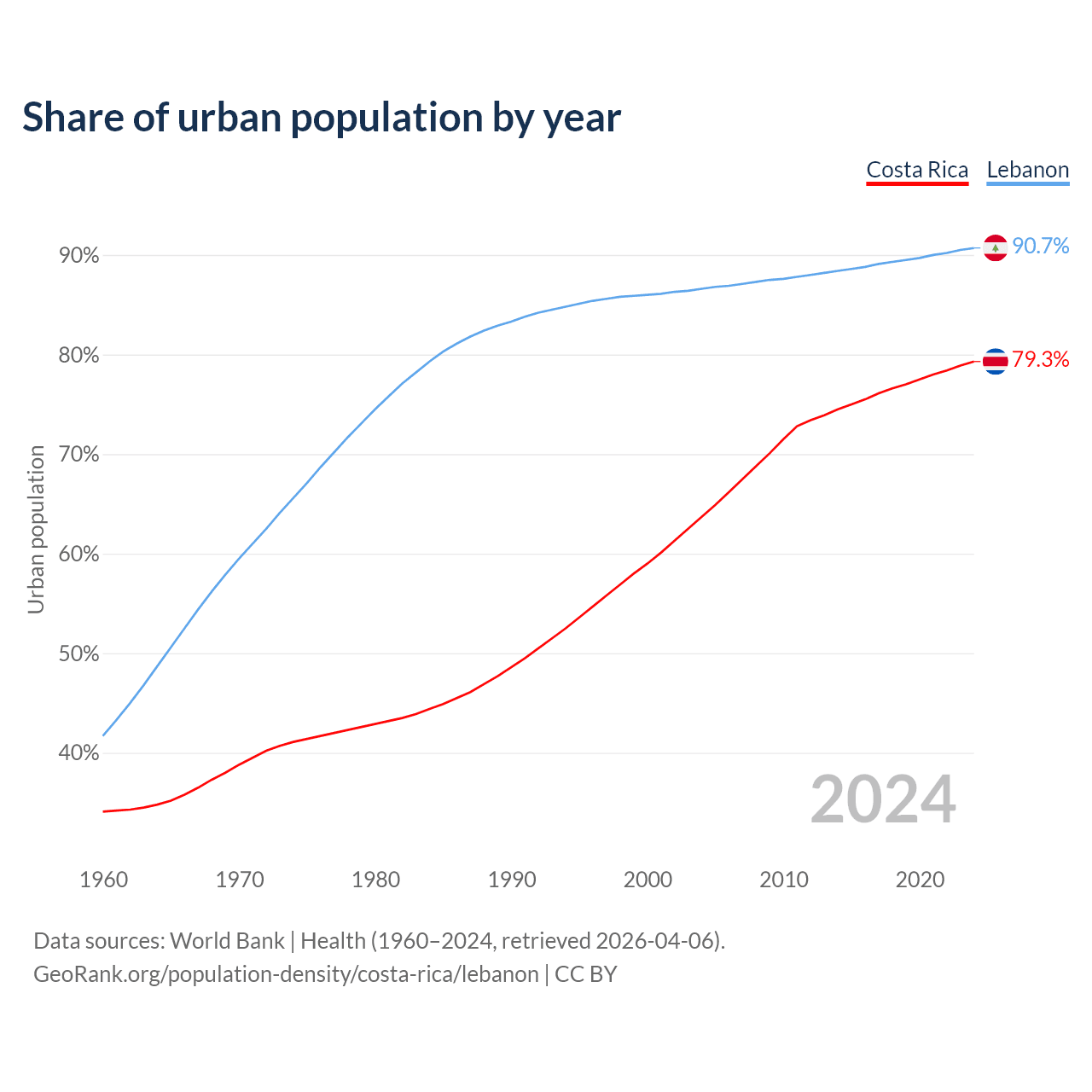 From 2004 to 2024, the share of urban population changed from 63.7% to 79.3% in Costa Rica and from 86.6% to 90.7% in Lebanon.