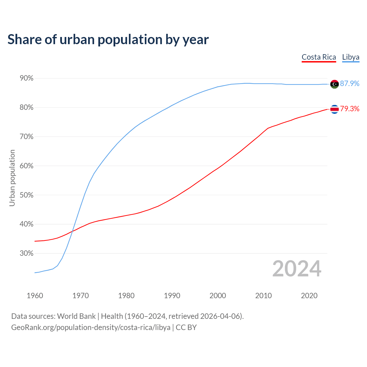 From 2004 to 2024, the share of urban population changed from 63.7% to 79.3% in Costa Rica and from 88% to 87.9% in Libya.