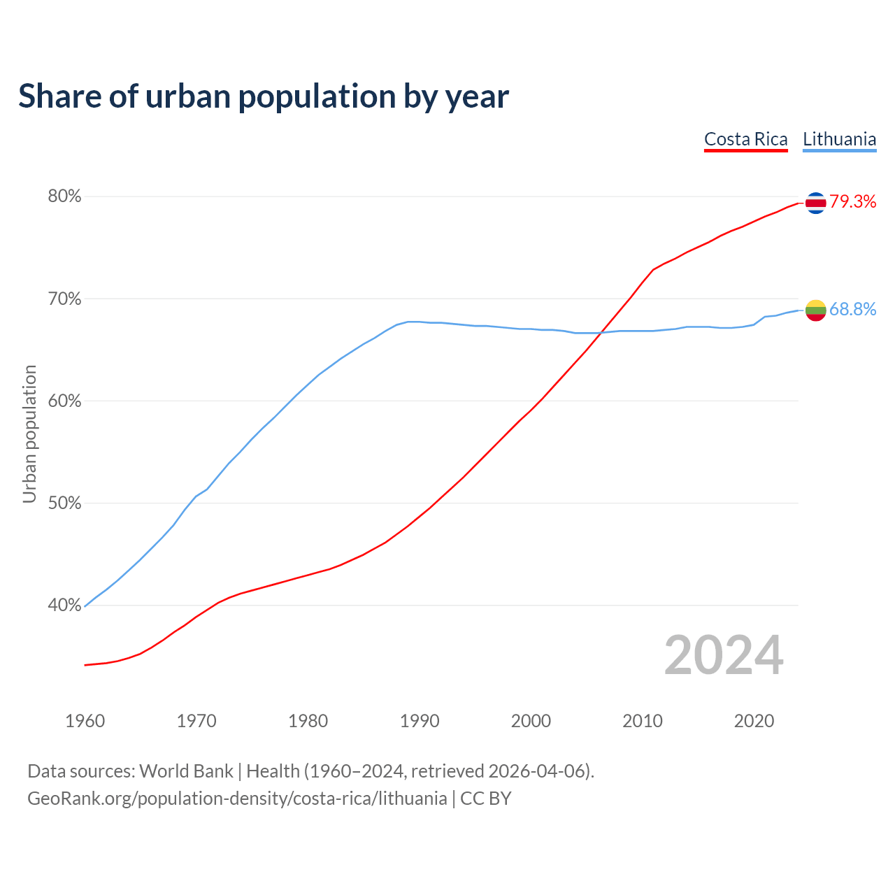 From 2004 to 2024, the share of urban population changed from 63.7% to 79.3% in Costa Rica and from 66.6% to 68.8% in Lithuania.