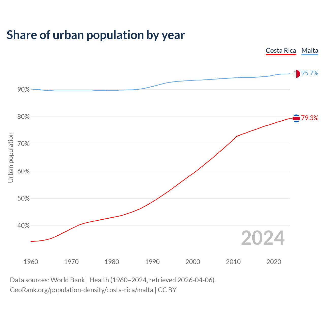 From 2004 to 2024, the share of urban population changed from 63.7% to 79.3% in Costa Rica and from 93.6% to 95.7% in Malta.