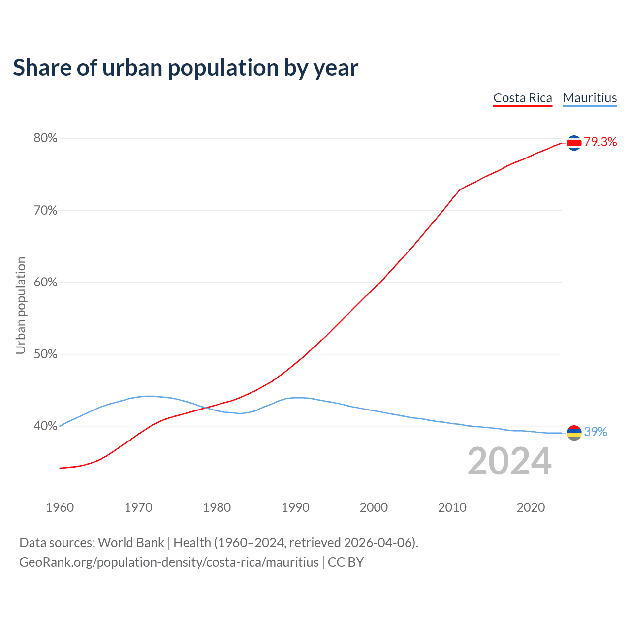 From 2004 to 2024, the share of urban population changed from 63.7% to 79.3% in Costa Rica and from 41.3% to 39% in Mauritius.