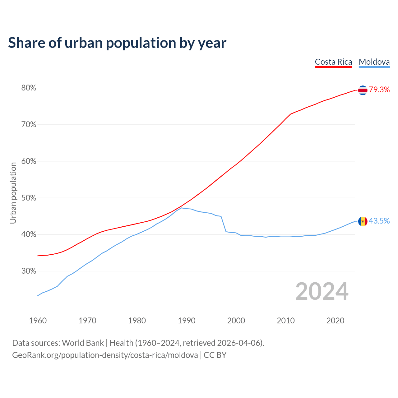 From 2004 to 2024, the share of urban population changed from 63.7% to 79.3% in Costa Rica and from 39.4% to 43.5% in Moldova.