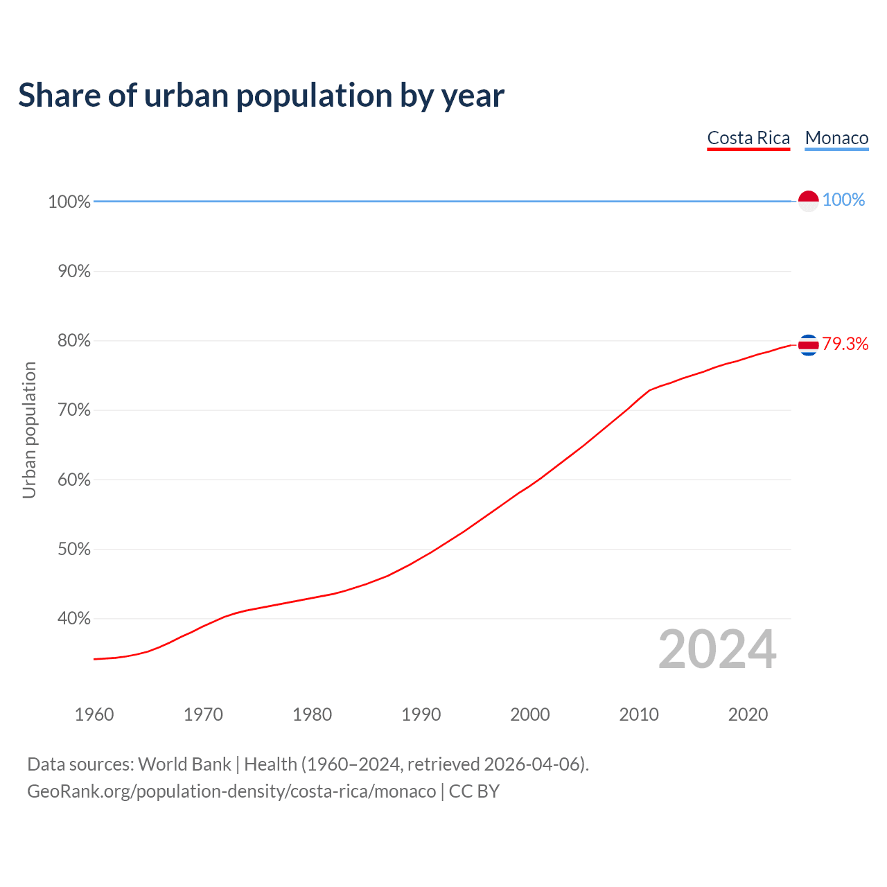 From 2004 to 2024, the share of urban population changed from 63.7% to 79.3% in Costa Rica and from 100% to 100% in Monaco.