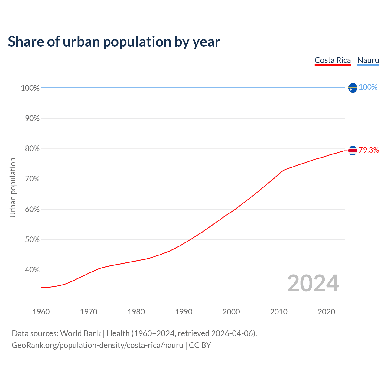From 2004 to 2024, the share of urban population changed from 63.7% to 79.3% in Costa Rica and from 100% to 100% in Nauru.
