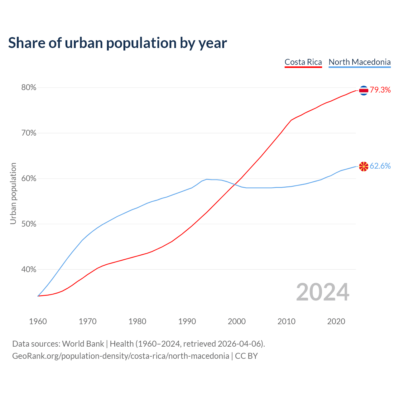 From 2004 to 2024, the share of urban population changed from 63.7% to 79.3% in Costa Rica and from 57.9% to 62.6% in North Macedonia.