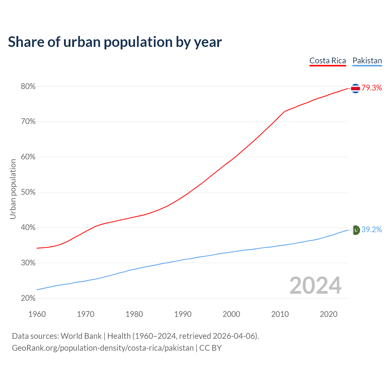 From 2004 to 2024, the share of urban population changed from 63.7% to 79.3% in Costa Rica and from 33.7% to 39.2% in Pakistan.